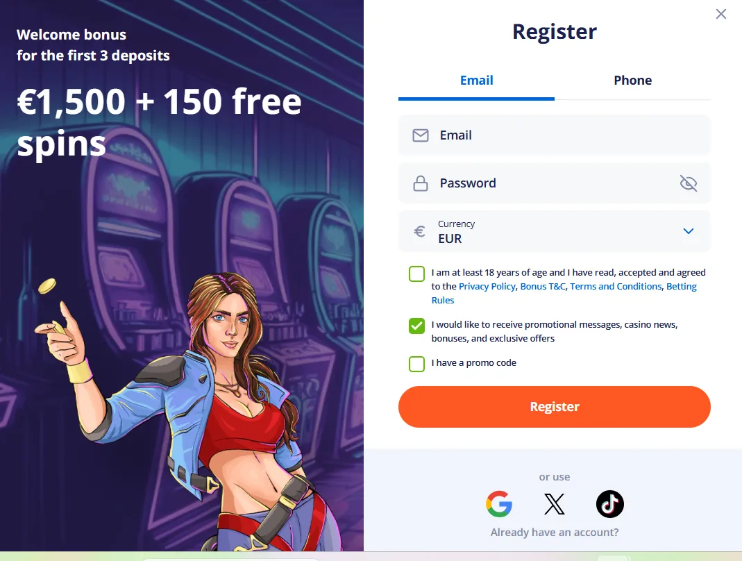 Atminkite, kad pasiūlymas galioja tik pirmiems trims depozitams, padarytiems per 2 dienas po aktyvavimo. Jei pirmasis įnašas nepadaromas per 60 min. po registracijos, vietoje išskirtinio pasiūlymo bus suteiktas standartinis paketas – iki €1,500 + 130 FS. Nemokamų sukimų statymas: 0.2 EUR / USD (arba ekvivalentas kitomis valiutomis).